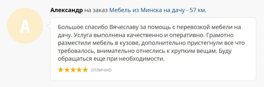 Большое спасибо Вячеславу за помощь с перевозкой мебели на дачу. Услуга выполнена качественно и оперативно. Грамотно разместили мебель в кузове, дополнительно пристегнули все что требовалось, внимательно отнеслись к хрупким вещам. Буду обращаться еще при необходимости.